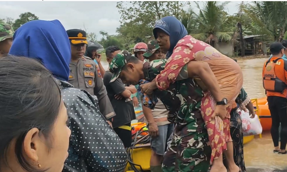 Tampak di lokasi, Dandim antusias ikut menggendong salah satu warga Kelurahan Tamanan yang terjebak banjir untuk di evakuasi ke tempat yang aman dari luapan air yang menggenang di lokasi banjir.