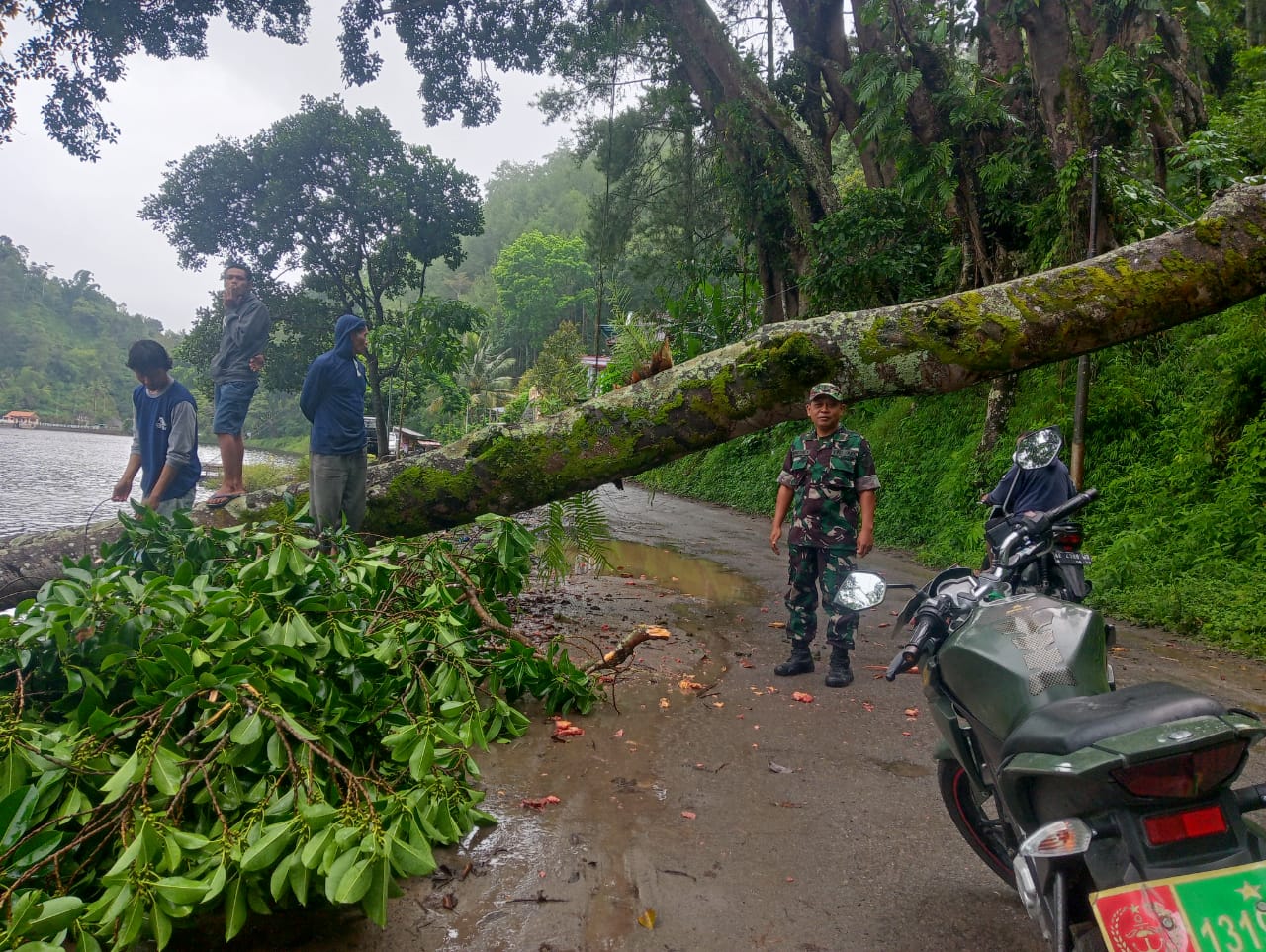 “ Benar saja, ada pohon karet yang memang sudah sangat tua dan akarnya lapuk ambruk atau tumbang menutup jalan keliling Telaga Ngebel ini, “ ucap Bati Bakti Koramil Tipe B 0802/19 Ngebel.