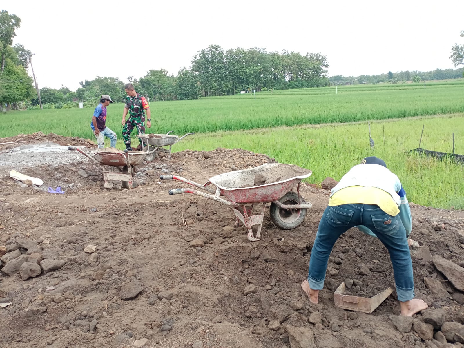 Kedekatan seorang Babinsa Pos Koramil Gerih Serda Edi Rinanto bersama warga masyarakat sangat terlihat,hal ini di buktikan dengan adanya kegiatan gotong royong pengurukan jalan yang menuju area persawahan.