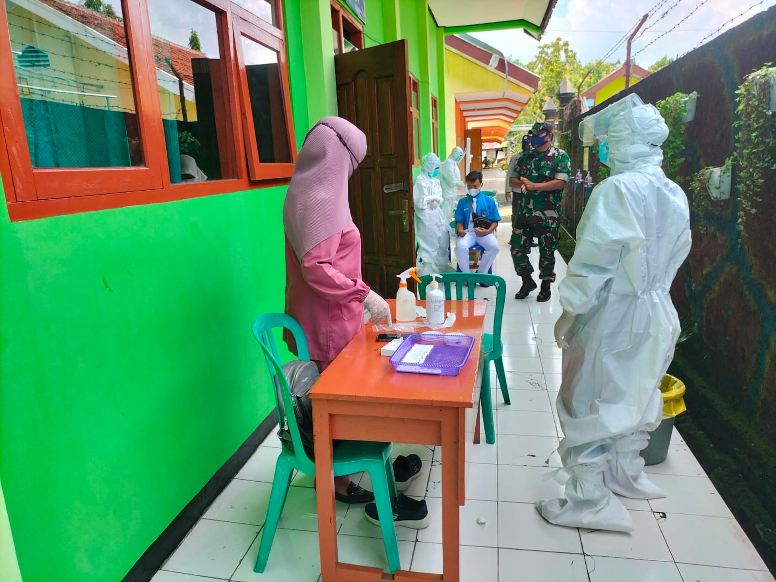 SULUHNEWS.ID, MADIUN – Tekait adanya siswa SMP 1 Mejayan yang terkonfimasi positif Covid-19. Babinsa Koramil 0803-08/Mejayan, Kodim 0803/Madiun Serda Agus Riyanto bersama Bhabinkamtibmas dan tim Puskesmas Mejayan melaksanakan tracing dan test swab antigen terhadap siswa dan guru kontak erat dengan pasien terkonfirmasi positif Covid-19 di SMP 1 Mejayan Jl. Panglima Sudirman No. 71, Kec. Mejayan, Kabupaten Madiun, Rabu (9/02/2022)