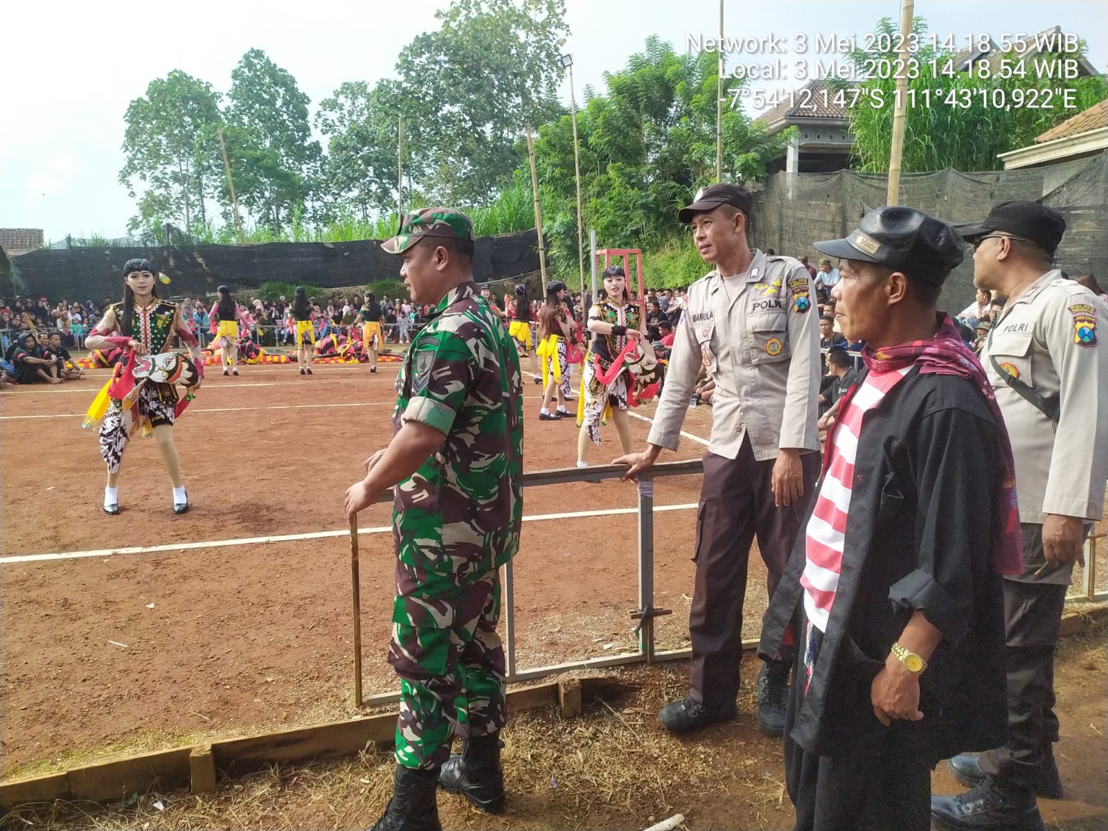 SULUHNEWS.ID, TRENGGGALEK – Babinsa Koramil 0806/04 Bendungan jajaran Kodim 0806/Trenggalek Sertu Heri bersinergi dengan Bhabinkamtibmas Polsek Bendungan melaksanakan pengamanan pentas seni reog dalam rangka halal bihalal masyarakat Desa Botoputih, Kecamatan Bendungan, Kabupaten Trenggalek, Kamis (04/05/2023).