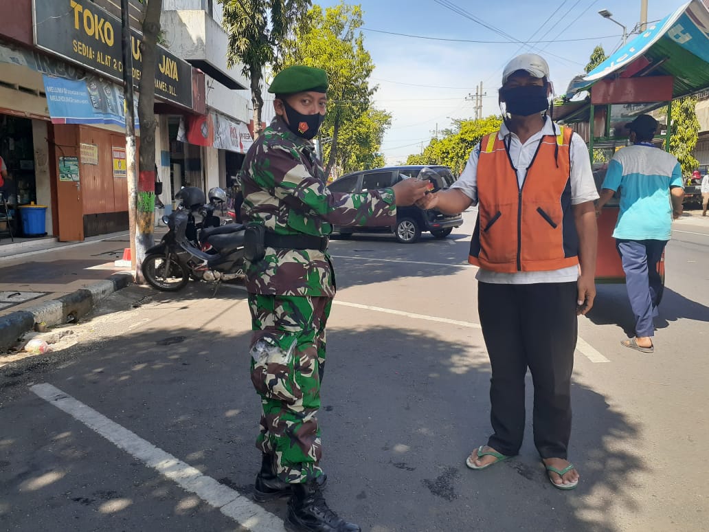Kali ini Babinsa jajaran Kodim 0803/Madiun melaksanakan pembagian masker gratis yang berlogokan TNI dan POLRI kepada masyarakat, Jumat (10/7/2020).