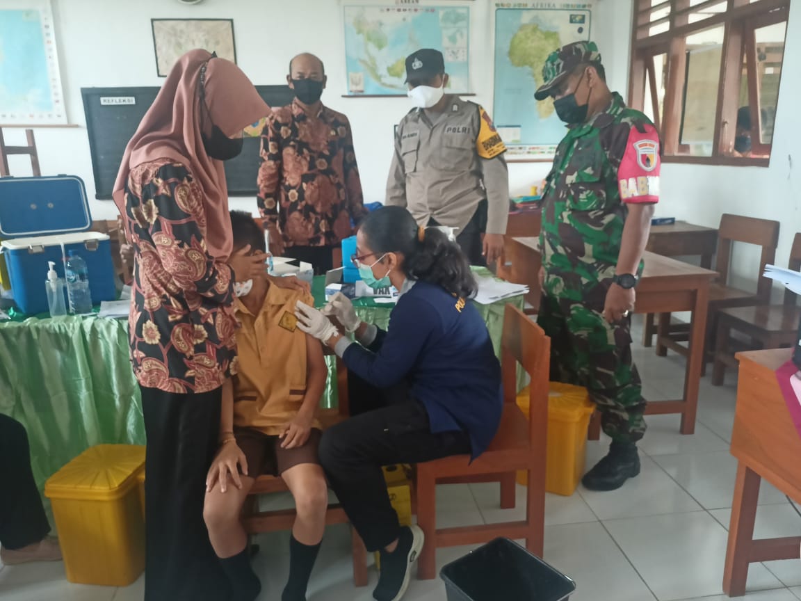 Pada kesempatan tersebut Babinsa bersama Bhabinkamtibmas memantau langsung pelaksanaan penyuntikan vaksin Sinovac untuk 148 siswa. Serangkaian prosedur dilakukan sebelum penyuntikan vaksin, diantaranya terlebih dahulu melaksanakan pendaftaran dilanjutkan dengan pemeriksaan screening kemudian dilakukan penyuntikan vaksin.