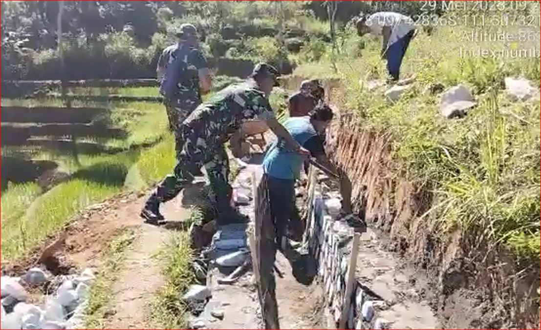 Sejak pagi, Serma Dodi W. selaku Babinsa Selur, dan empat orang anggota Koramil Tipe B 0802/12 Ngrayun bersama warga RT. 03/02 Dukuh Gamping, Desa Selur, Kecamatan Ngrayun, Kabupaten Ponorogo bergotong royong membangun talud sepanjang kurang lebih 250 meter.