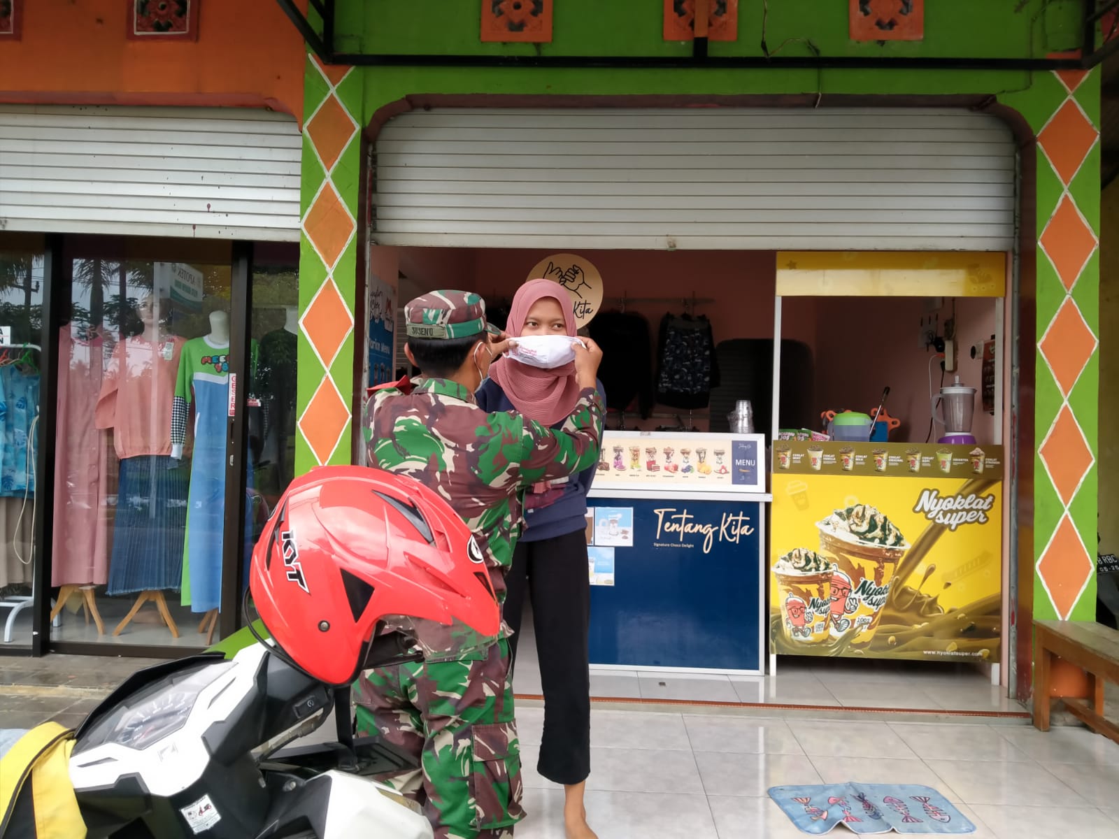“Selain memberikan himbauan agar selalu mematuhi protokol kesehatan selama pandemi Covid-19, Babinsa Sudimoro juga membagikan masker gratis kepada pedagang, pengunjung dan tukang parkir Pasar Bawur Sudimoro, sebagai wujud kepedulian terhadap kesehatan mereka agar tidak tertular Covid-19”, Katanya.