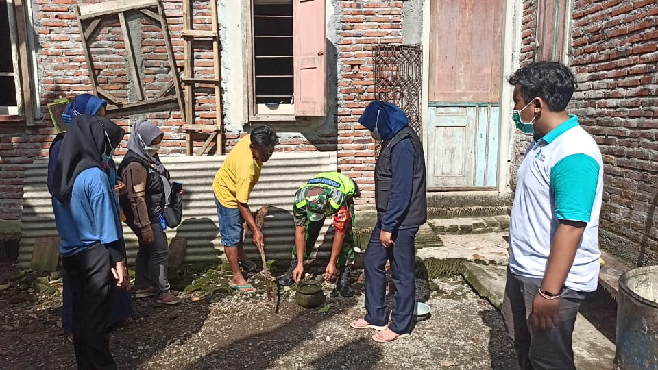 Pada kesempatan ini Serda Sumarji bersama Kader Jumantik mengajak seluruh warga untuk memberantas jentik nyamuk yang ada di genangan berisi air dengan menebar bubuk abate.