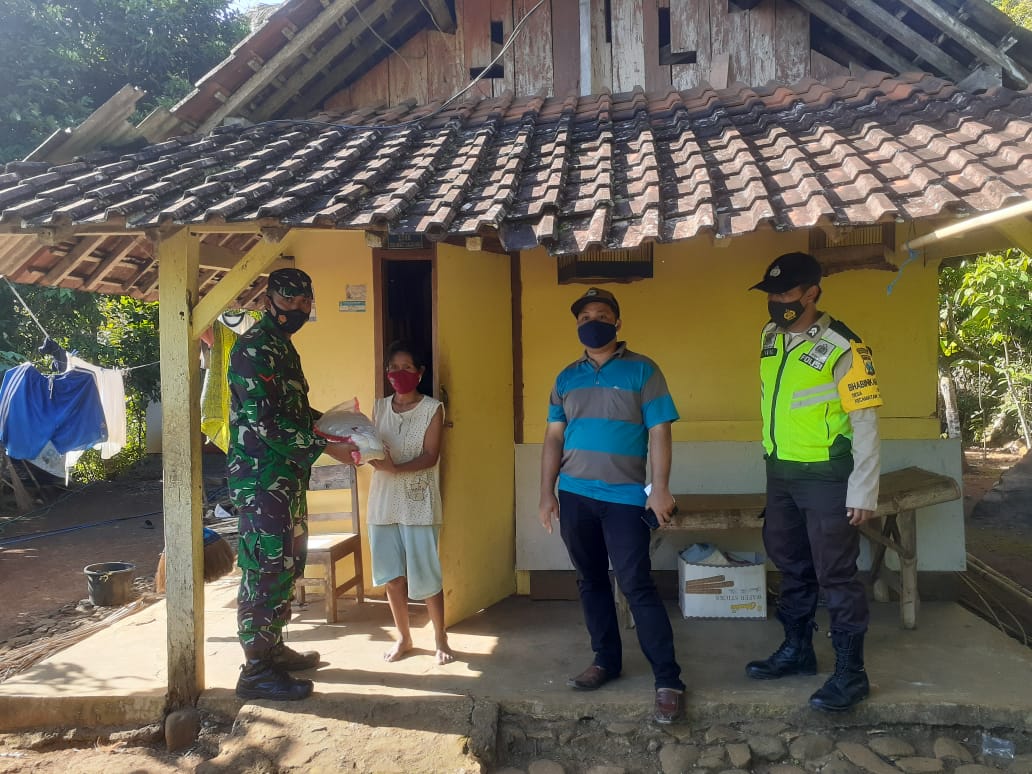 Terlihat Babinsa Watuagung Kopda Ahmad Teguh menyalurkan bantuan Sembako berupa beras dari Kodim 0806/Trenggalek kepada warga binaannya yang terkena dampak PPKM darurat