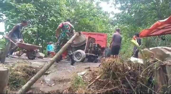 SULUHNEWS.ID, NGAWI – Anggota Koramil 0805/07 Ngrambe Kodim 0805/Ngawi Sertu Sumardi melaksanakan kegiatan karya bakti perbaikan jalan di Desa Manisharjo Kecamatan Ngrambe, Jum’at, (03/02/2023)
