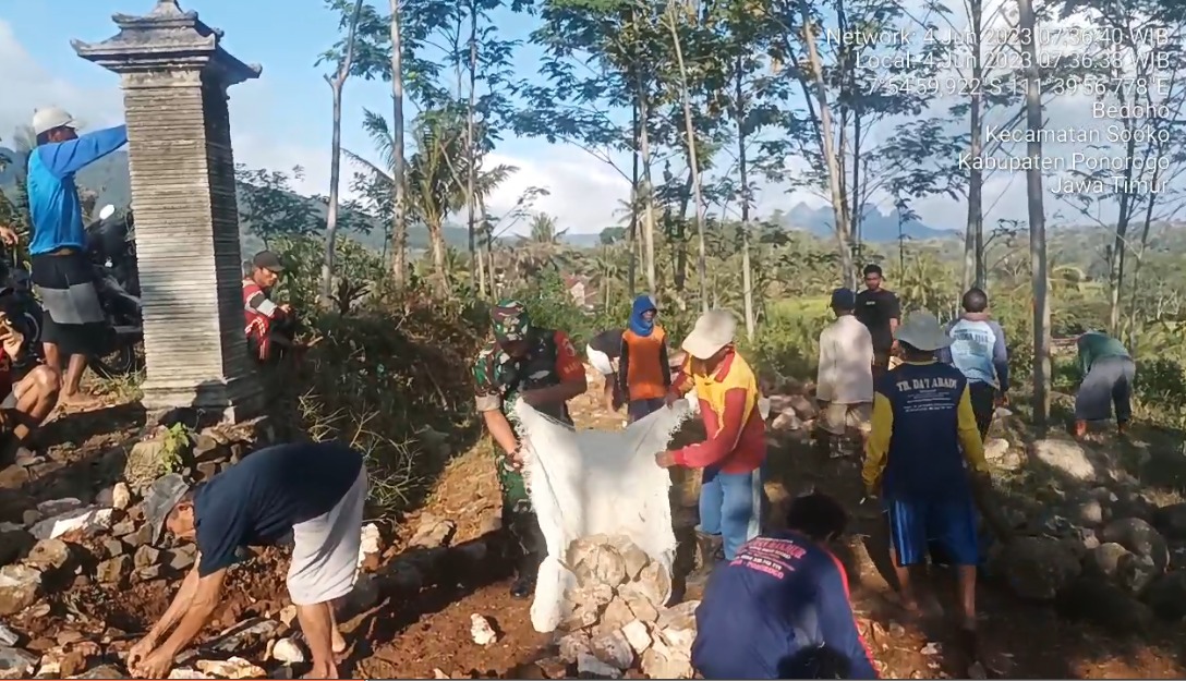Seperti halnya yang dilakukan Serda Arif Syaifudin, Babinsa Bedoho hari ini, dia turut bergabung bersama warga Dukuh Jetis, Desa Bedoho, Kecamatan Sooko, Kabupaten Ponorogo dalam membangun jalan menuju makan desa tersebut.