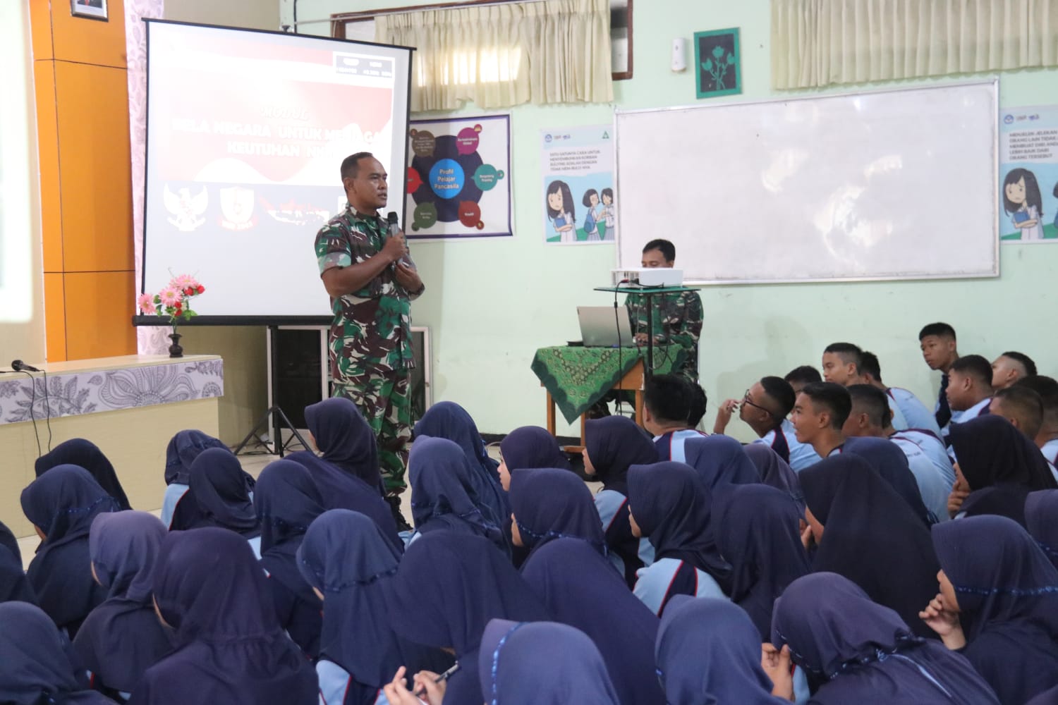 Di hadapan para siswa dan siswi Dandim memaparkan materi tentang prinsip dasar Wasbang dan berbagai metode dalam mewujudkan seorang pemimpin di kalangan pemuda.