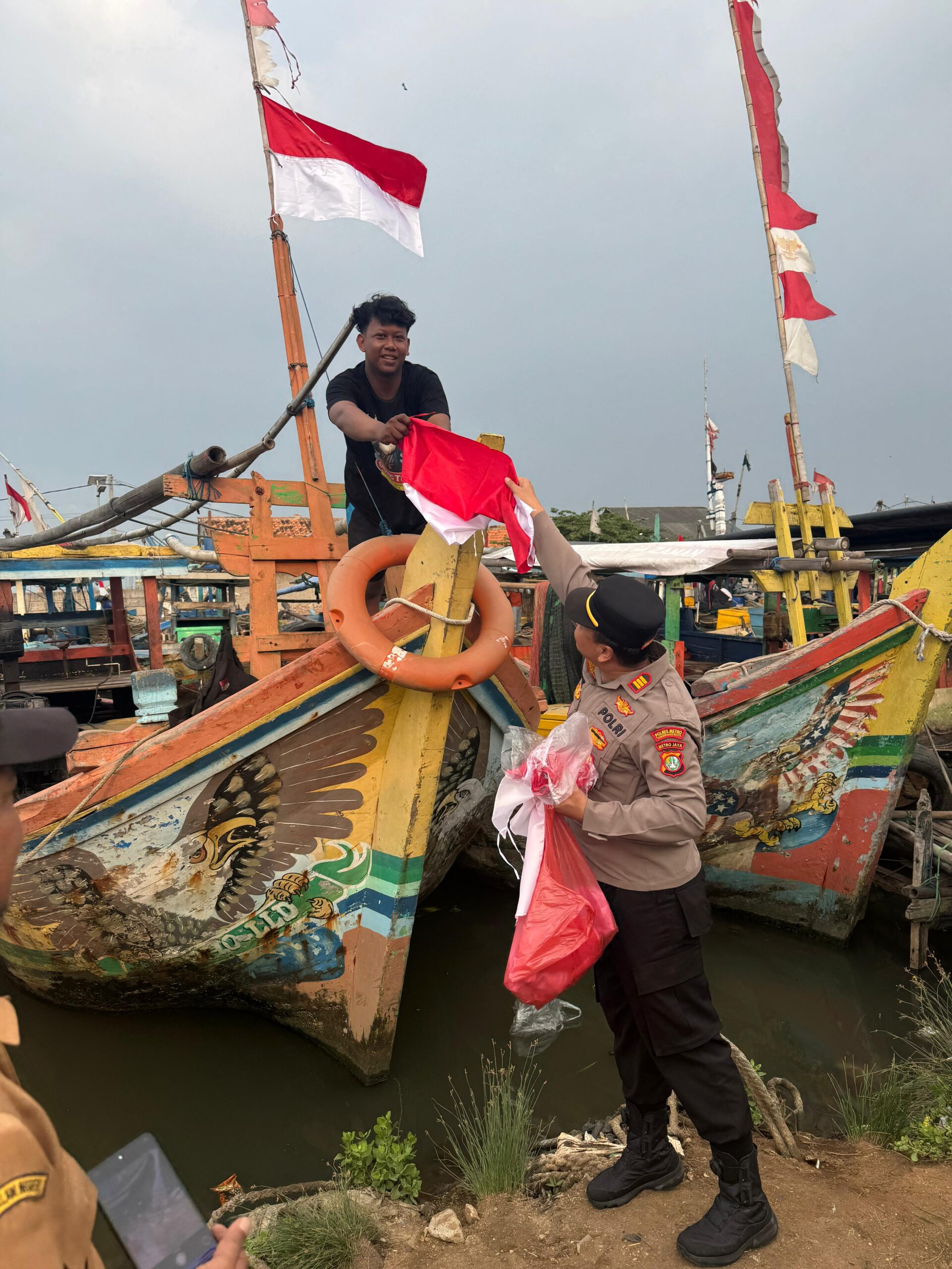 “Kami hari ini bersama jajaran personel Polsek Pakuhaji dan Polres Metro Tangerang Kota, sengaja mendatangi para nelayan di Pelabuhan Cituis, Desa Surya Bahari, untuk membagikan Bendera Merah Putih yang langsung dipasang di beberapa kapal milik nelayan di Cituis ini,” ungkapnya.