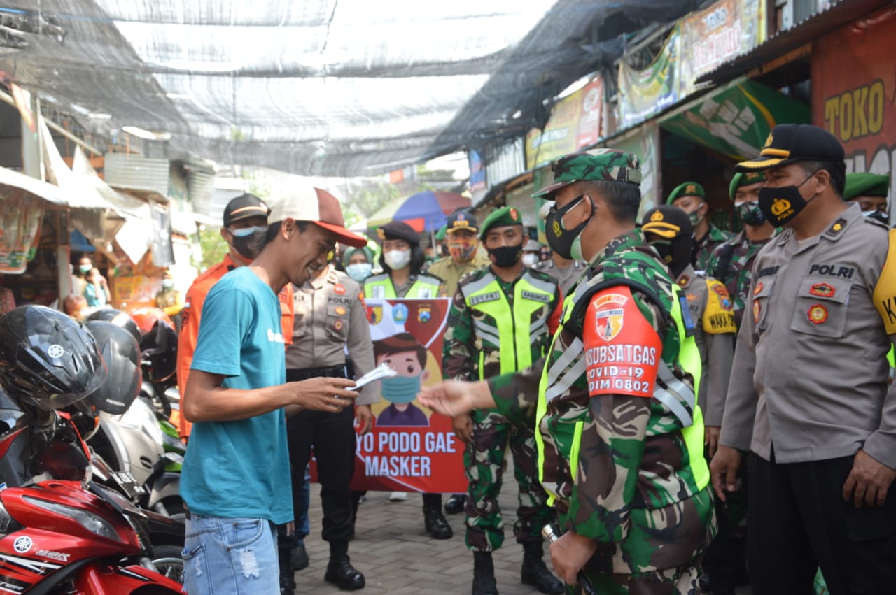SULUHNEWS.ID, PONOROGO – Dalam rangka mencegah dan memutus penyebaran Covid-19 di wilayah Ponorogo khususnya di Kecamatan Sukorejo, hari ini Koramil tipe B 0802/06 Sukorejo bersama Polsek Sukorejo dan Pemerintah Kecamatan Sukorejo melaksanakan operasi yustisi dan bagi – bagi masker di dalam Pasar Mlancar, Desa Gegeran dan perempatan Ngambakan Sukorejo, Kecamatan Sukorejo Kabupaten Ponorogo, Minggu (31/01/21).