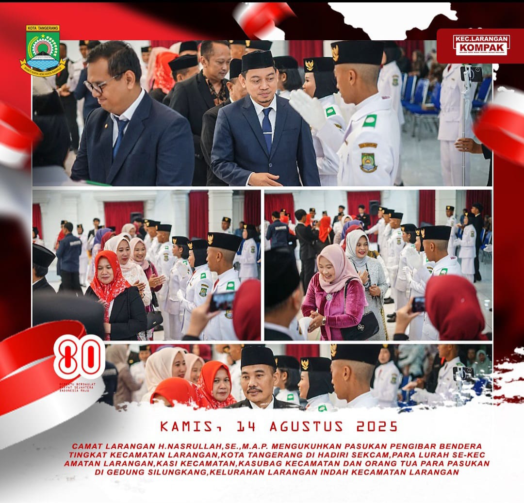 Paskibra tingkat Kecamatan Larangan, Kota Tangerang, tahun 2025 yang secara resmi dikukuhkan oleh Camat Larangan, H. Nasrullah, S.E., M.A.P., di gedung Silungkang, Kelurahan Larangan Indah, Kecamatan Larangan, Kamis malam (14/8/2025).