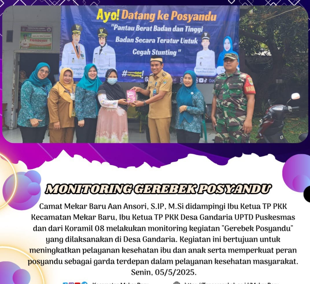 Camat Mekar Baru Aan Ansori didampingi Ketua TP.PKK Mekar Baru, Ketua TP.PKK Desa Gandaria, UPTD Puskesmas dan anggota Koramil 08 melakukan monitoring kegiatan Gerebek Posyandu.