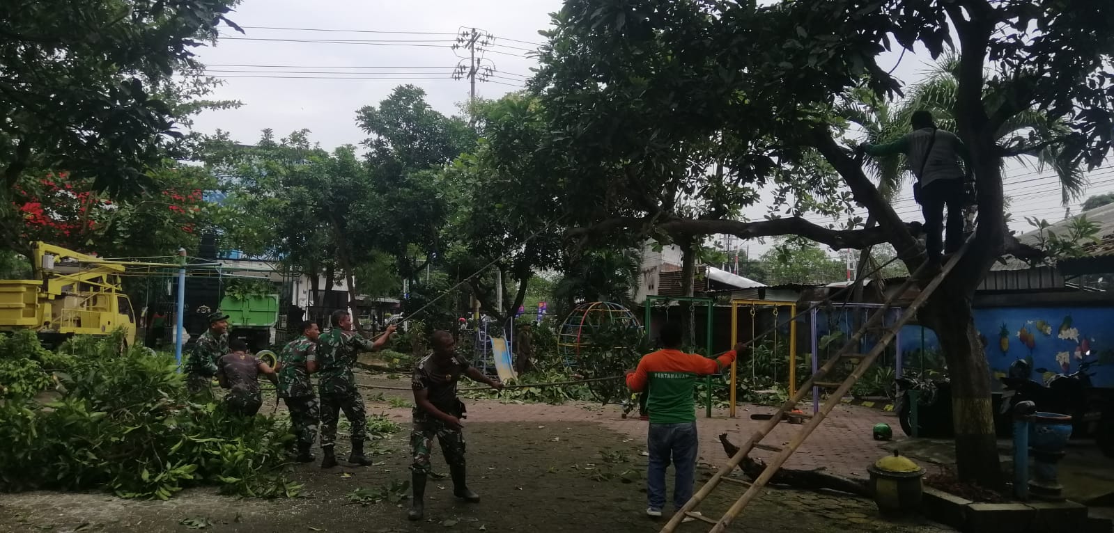 “Kegiatan ini dilakukan sebagai salah satu upaya menjaga keamanan dan kenyamanan lingkungan sekitar TK Kartika IV/28 Kodim 0807 Tulungagung dari resiko kecelakaan yang disebabkan oleh pohon yang sudah tua dan tidak sehat karena hujan maupun angin kencang.” ungkap Danramil Ngunut tersebut.