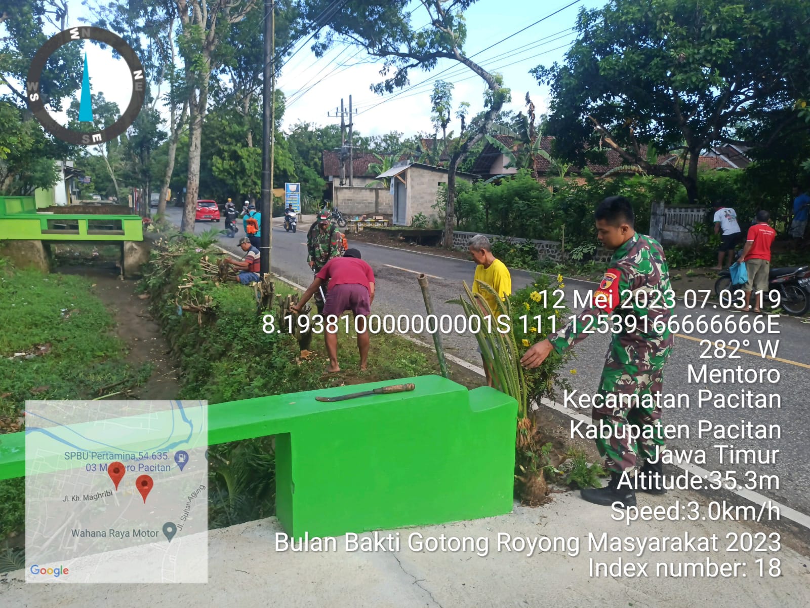 SULUHNEWS.ID, PACITAN – Dalam rangka menjaga kebersihan dan kenyamanan lingkungan, Babinsa Koramil 0801/01 Pacitan Kodim 0801/Pacitan, bersama warga masyarakat melakukan kerja bakti pembersihan di sepanjang jalan Maghribi Desa Mentoro, Kec. Pacitan, Kab. Pacitan, Jumat (12/05/2023).