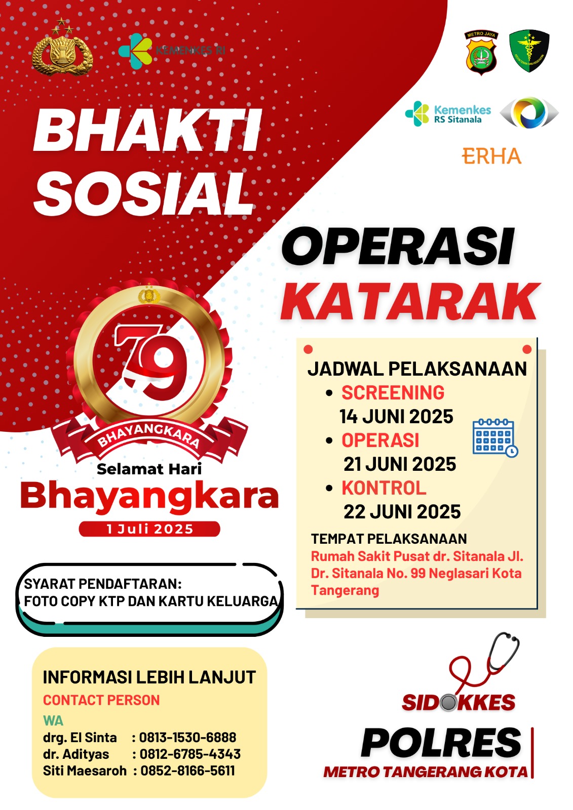 SULUHNEWS.ID, TANGERANG – Kabar baik, dalam rangkaian peringatan Hari Bhayangkara ke-79, Polres Metro Tangerang Kota, Polda Metro Jaya pada tanggal 21 Juni 2025 mendatang akan melaksanakan kegiatan bhakti kesehatan berupa operasi katarak secara gratis untuk masyarakat yang kurang mampu.