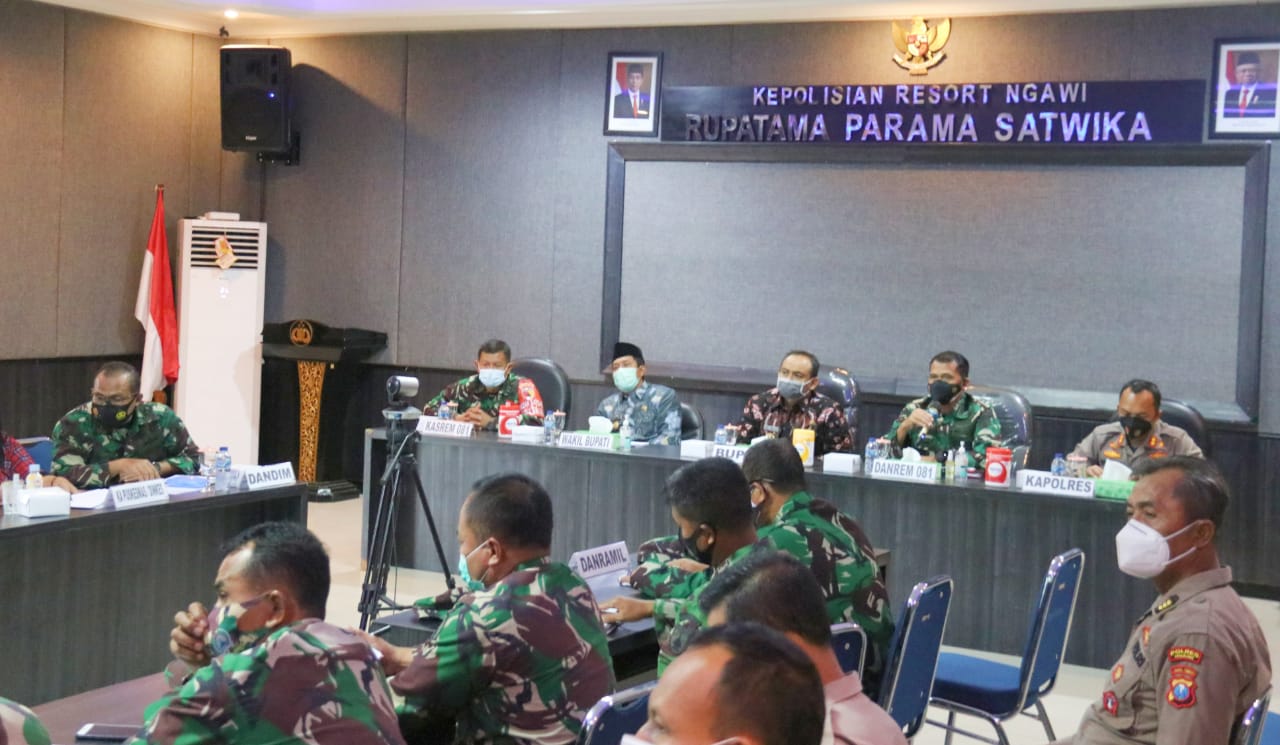 SULUHNEWS.ID, NGAWI – Dandim 0805/Ngawi Letkol Inf Totok Prio Kismanto,S.E.,menghadiri rapat koordinasi dan evaluasi penanganan Covid-19 Kabupaten Ngawi bertempat di Ruang Rapat Rupatama Parama Satwika Polres Ngawi,Kamis (25/06/2021).