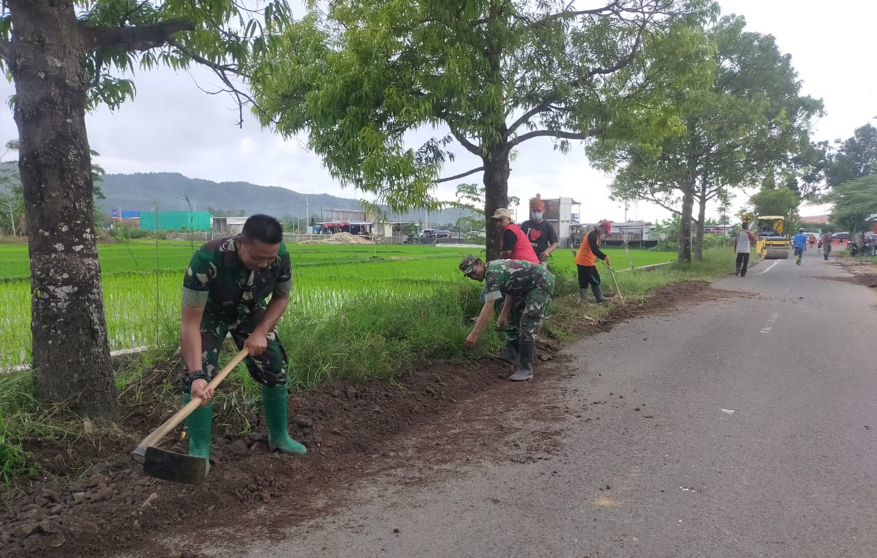 Seperti terlihat dilokasi kerja bakti, anggota koramil bersama warga bahu membahu memperbaiki jalan yang rusak dengan menimbun tanah untuk menutupi jalan yang lubang.