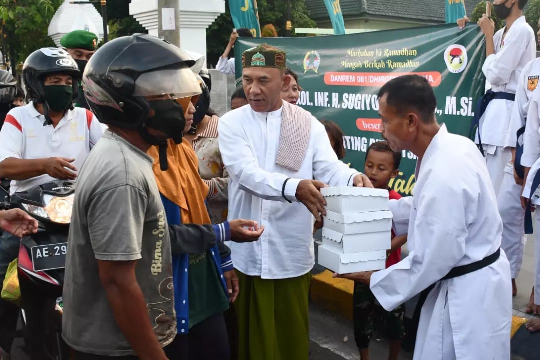 Tak kurang 600 paket takjil mereka bagikan kepada para pengendara yang melintas di depan Korem 081/DSJ yang berlokasi di jalan Pahlawan Kota Madiun.