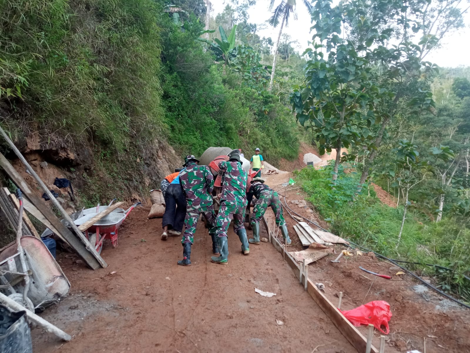 SULUHNEWS.ID, PACITAN – Anggota TNI dari Kodim 0801/Pacitan dan masyarakat terus meningkatkan kerjasama, saling membantu satu sama lain untuk mempercepat pengerjaan sasaran fisik pada Pra TMMD ke-117 yang berlokasi di Desa Ketroharjo, Kec. Tulakan, Kab. Pacitan, Jumat (30/06/2023).