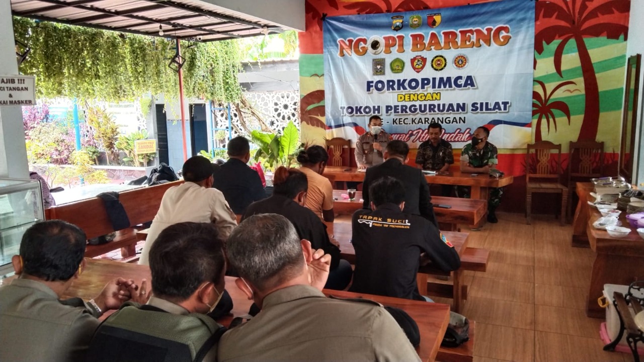 SULUHNEWS.ID, TRENGGALEK – Dalam rangka menjaga kondusifitas Kamtibmas menjelang Bulan Suci Ramadhan, Forkopimcam Karangan menggelar Ngopi Bareng bersama tokoh perguruan silat yang ada di wilayah Kecamatan Karangan, Trenggalek, Jumat (25/032022).
