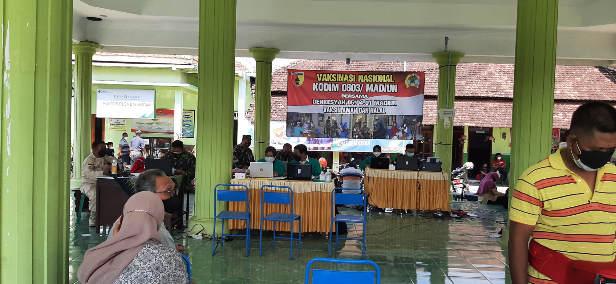 SULUHNEWS.ID, MADIUN – Serbuan vaksinasi TNI terus dilaksanakan untuk mewujudkan Herd Immunity. Bertempat di Balai Desa Dagangan, Kec. Dagangan, Kab. Madiun, Kamis (22/7), Kodim 0803/Madiun besama Denkesyah 05.04.01 Madiun dan Puskesmas Dagangan kembali menggelar vaksinasi Covid-19 tahap l.