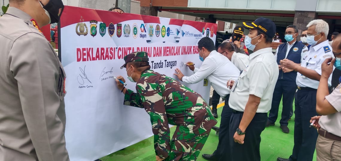 SULUHNEWS.ID.Komandan Kodim 0506/Tgr Korem 052/Wkr Kolonel Inf Bambang, menghadiri deklarasi bersama menolak unjuk rasa anarkis bertempat di Halaman Mako Polres Kota Bandara Internasional Soekarno Hatta, Senin (19/10/2020) sore.