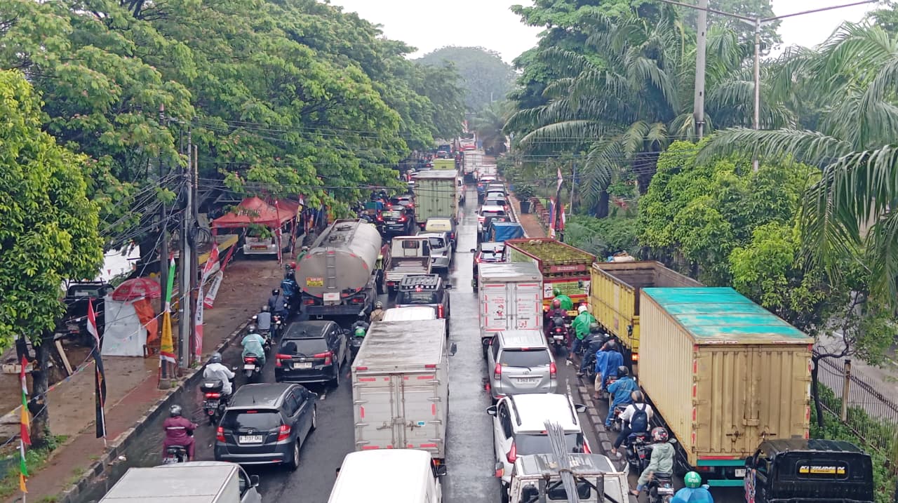 SULUHNEWS.ID, JAKARTA BARAT – Hujan deras yang mengguyur sejak Selasa pagi (19/08), mengakibatkan kemacetan panjang di Jalan Warung Gantung arah Tangerang. Pantauan di lokasi, antrean kendaraan didominasi truk kontainer, mobil pribadi, hingga sepeda motor yang terjebak padat merayap.