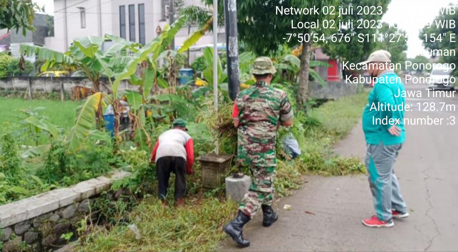 SULUHNEWS.ID, PONOROGO – Serma Suryadi, anggota Koramil Tipe B 0802/01 Kota Ponorogo, Kodim 0802/Ponorogo bersama warga Kelurahan Kauman, Kecamatan/ Kabupaten Ponorogo hari ini melaksanakan kerja bakti di sepanjang jalan di lingkungan mereka, Minggu (02/07/2023).