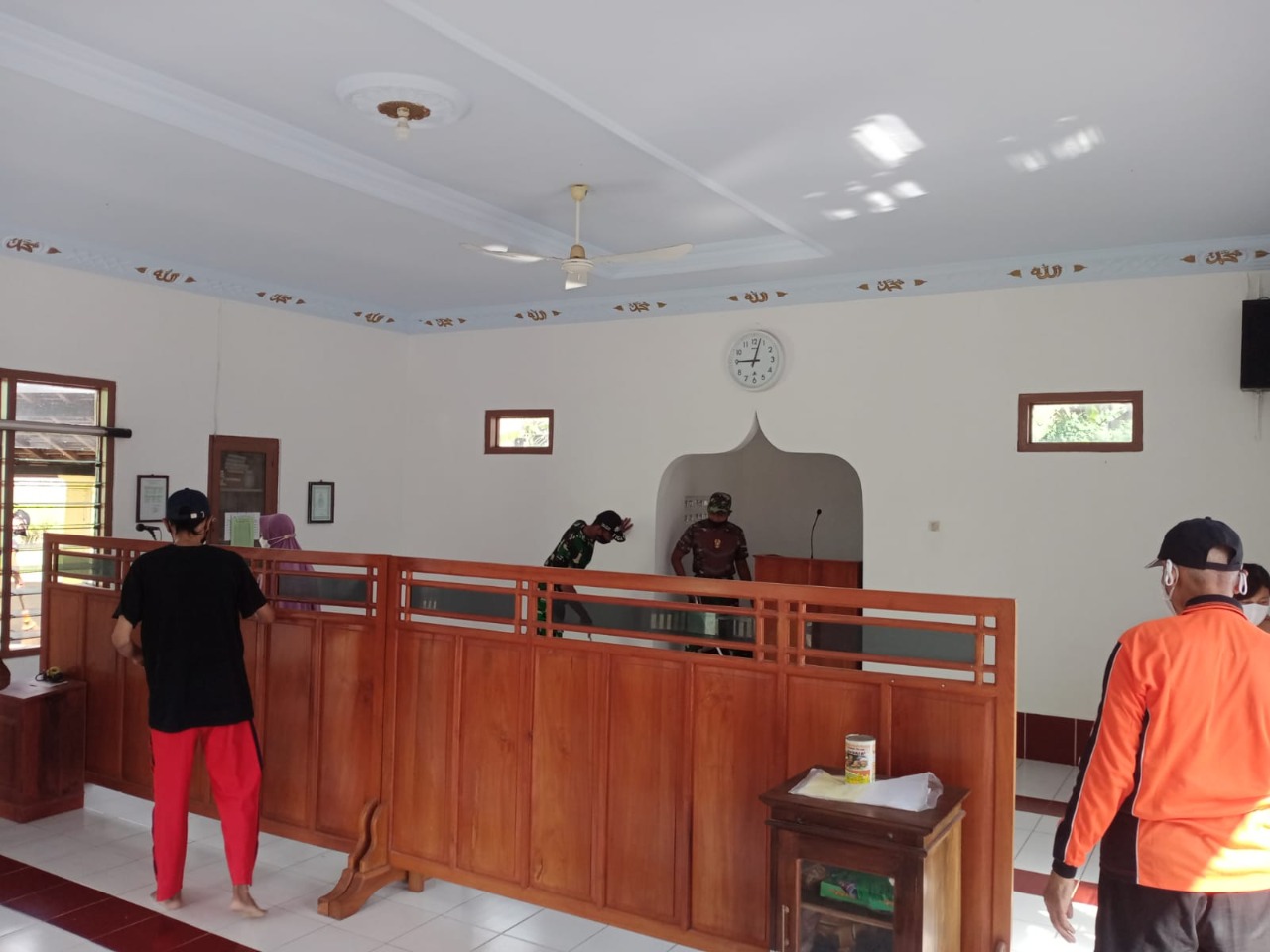 Tampak kekompakan antara anggota Posramil Suruh dengan warga dalam melaksakan pembersihan masjid dengan cara mengepel lantai Mesjid dan membersihkan perkarangan Mesjid agar pelaksanaan sholat Idul Fitri berjalan aman dan lancar.