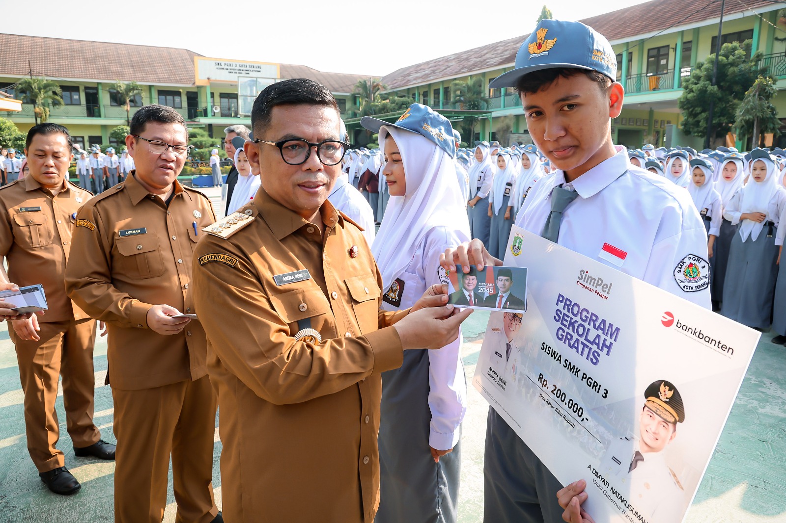 Gubernur menyerahkan secara simbolis rekening koran untuk SMK PGRI 3 dalam Program Sekolah Gratis. Perwakilan siswa menerima buku tabungan sekolah gratis.