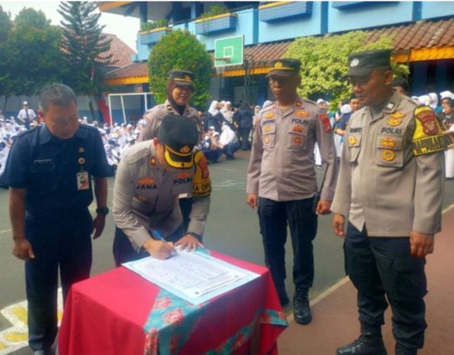 Setelah amanat Kapolsek, acara dilanjutkan dengan penandatanganan MoU sebagai simbol komitmen bersama untuk menciptakan lingkungan sekolah yang aman dan kondusif.