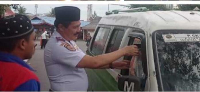 Kepala Terminal Kalideres Revi Zulkarnaen berserta jajaran dan personel Polsek Kalideres turun ke jalan untuk membagikan takjil kepada masyarakat yang melintas di area tersebut.