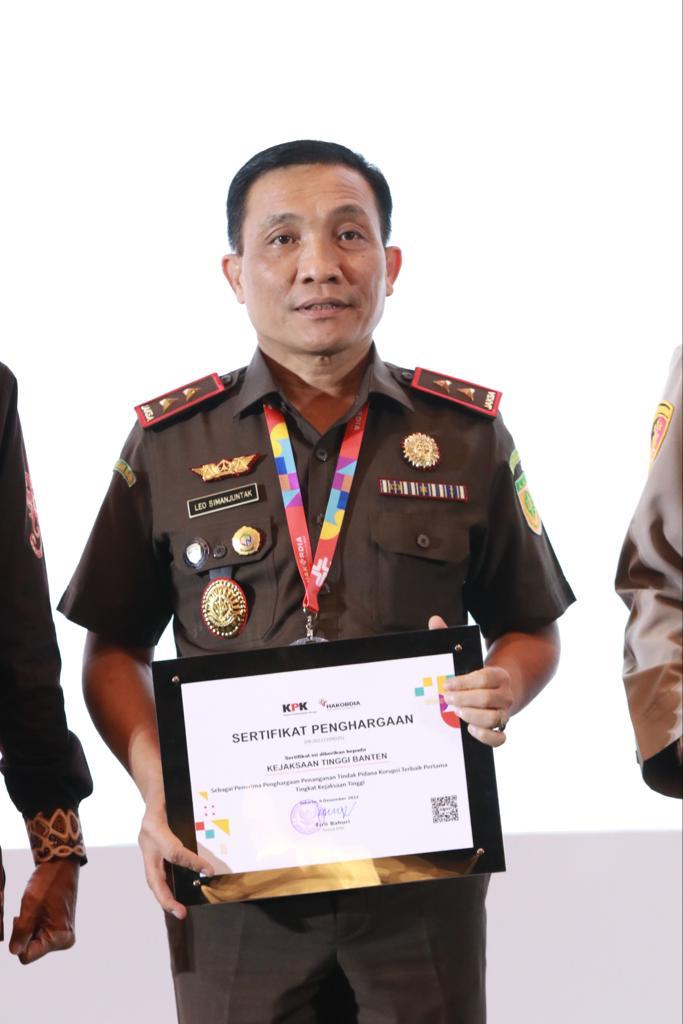 Kepala Kejaksaan Tinggi Banten Leonard Eben Ezer Simanjuntak menerima penghargaan tersebut dalam acara puncak Peringatan Hari Antikorupsi Sedunia (Hakordia) Tahun 2022 dengan tema ‘Indonesia Pulih Bersatu Berantas Korupsi’ yang dilaksanakan di Hotel Bidakara, Jakarta, Jumat (9/12/2022).