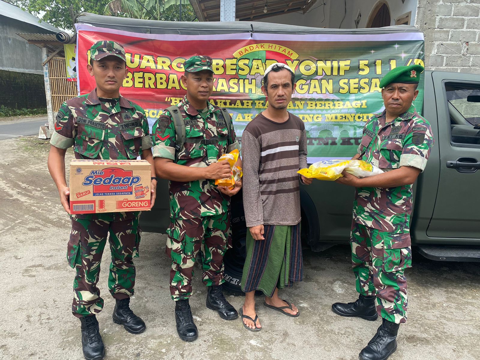 Jangan di nilai apa yang kami berikan ini kepada masyarakat. Namun inilah keiklasan kami, ini kemampuan kami meringankan beban masyarakat dalam menjalin tali silaturahmi antara masyarakat dan Yonif 511/DY. Semoga apa yang kami berikan ini dapat bermanfaat menjadi berkah bagi kita semua.