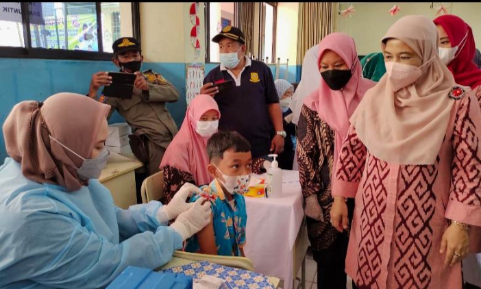Didampingi para pengurus PKK tingkat kota dan wilayah, pihak sekolah serta jajaran kecamatan-kelurahan setempat, Lilia Sentosa sempat menyapa dan berbincang dengan beberapa anak yang divaksin. Kegiatan menerapkan protokol kesehatan (prokes) Covid-19.