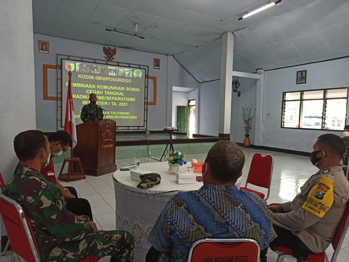 SULUHNEWS.ID, PONOROGO – Kodim 0802/Ponorogo hari ini menggelar kegiatan Pembinaan Komunikasi Sosial (Bin Komsos) cegah tangkal radikalisme/separatisme semester I tahun 2021 bertempat di Balai Prajurit Kodim 0882/Ponorogo, Kamis (03/06/2021).