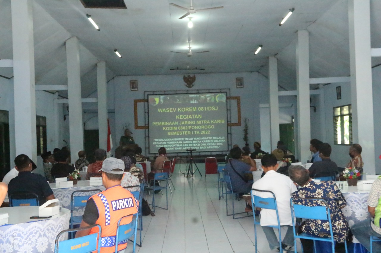 Pembentukan Mitra Karib oleh Kapten Inf Sunarji (Danramil tipe B 0802/ 06 Sukorejo), Pembinaan Mitra Karib oleh Kapten Arm Ahmad Hariono (Danramil tipe B 0802/ 08 Badegan), Pengendalian Jaring Mitra Karib oleh Kapten Cku Iskandar (Danramil tipe B 0802/10 slahung serta materi Pelaporan Jumlah Mitra Karib diberikan oleh Kapten Arm Sutami Pena (Pasiter Kodim 0802/ Ponorogo). (Ayu)