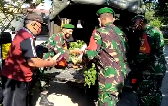 Dengan menggunakan kendaraan dinas yang disulap menjadi “mobil sayur”, anggota Kodim 0803/Madiun berkeliling door to door menyalurkan paket bantuan berupa sembako, buah dan sayur-sayuran kepada warga yang sedang isoman, Sabtu (24/7).