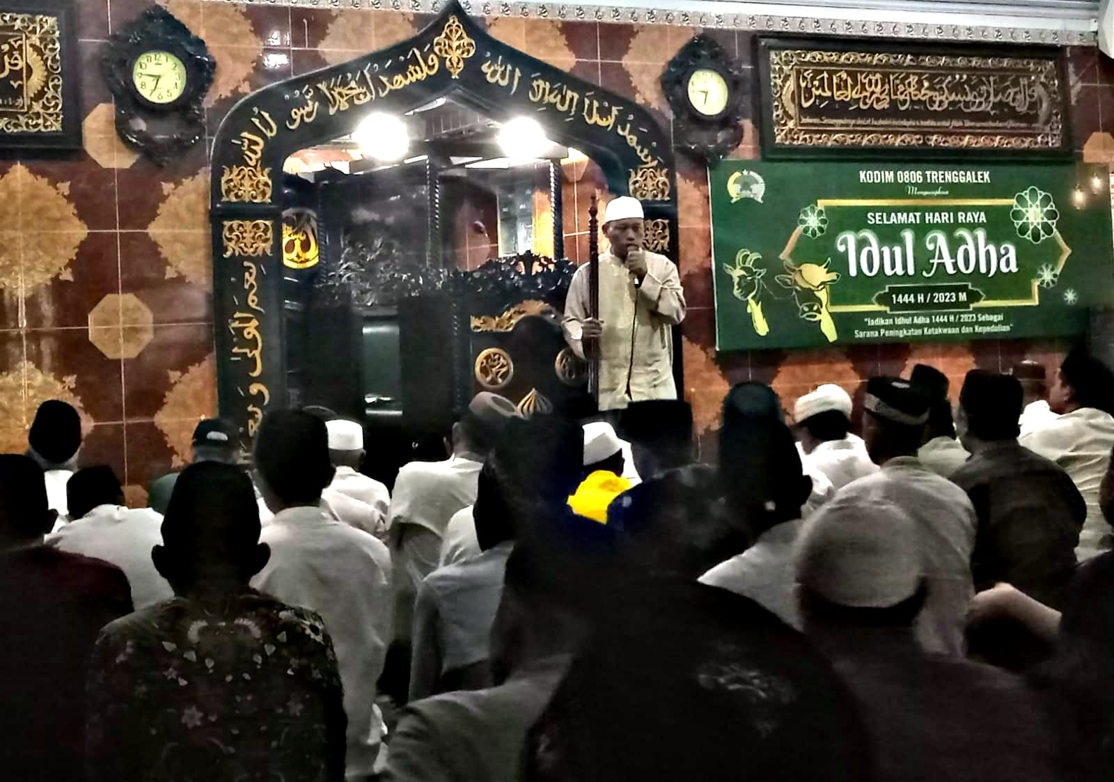 Acara ini dihadiri oleh Dandim 0806/Trenggalek Letkol Kav Peddy Adi Prasetyo, S.Sos., perwira staf Kodim, Ustad Prayit S.Pd.I. dari Kemenag Trenggalek, perwakilan anggota Kodim, dan warga masyarakat sekitar Kodim. Setelah sholat, kegiatan dilanjutkan dengan penyembelihan hewan kurban yang terdiri dari 6 ekor kambing. Perayaan ini adalah momen yang penuh dengan keharmonisan, kedermawanan, dan kebaikan.