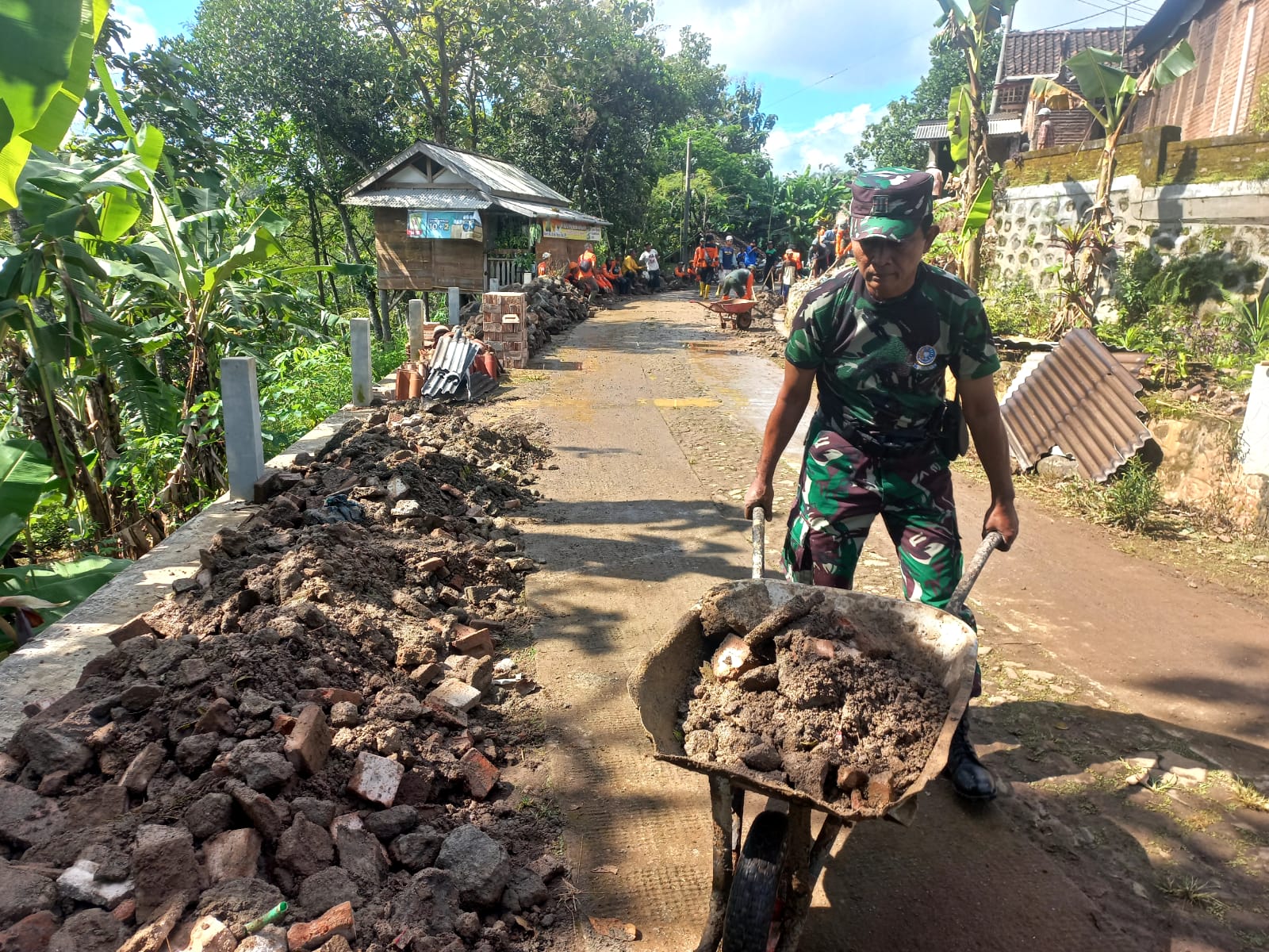 Di sela-sela kegiatannya Danramil 08/Jogorogo Lettu Inf Suyanto menyampaikan untuk mengatasi kesulitan warga, Koramil Jogorogo bersama masyarakat sekitar melaksanakan karya bakti pembersihan material longsor.