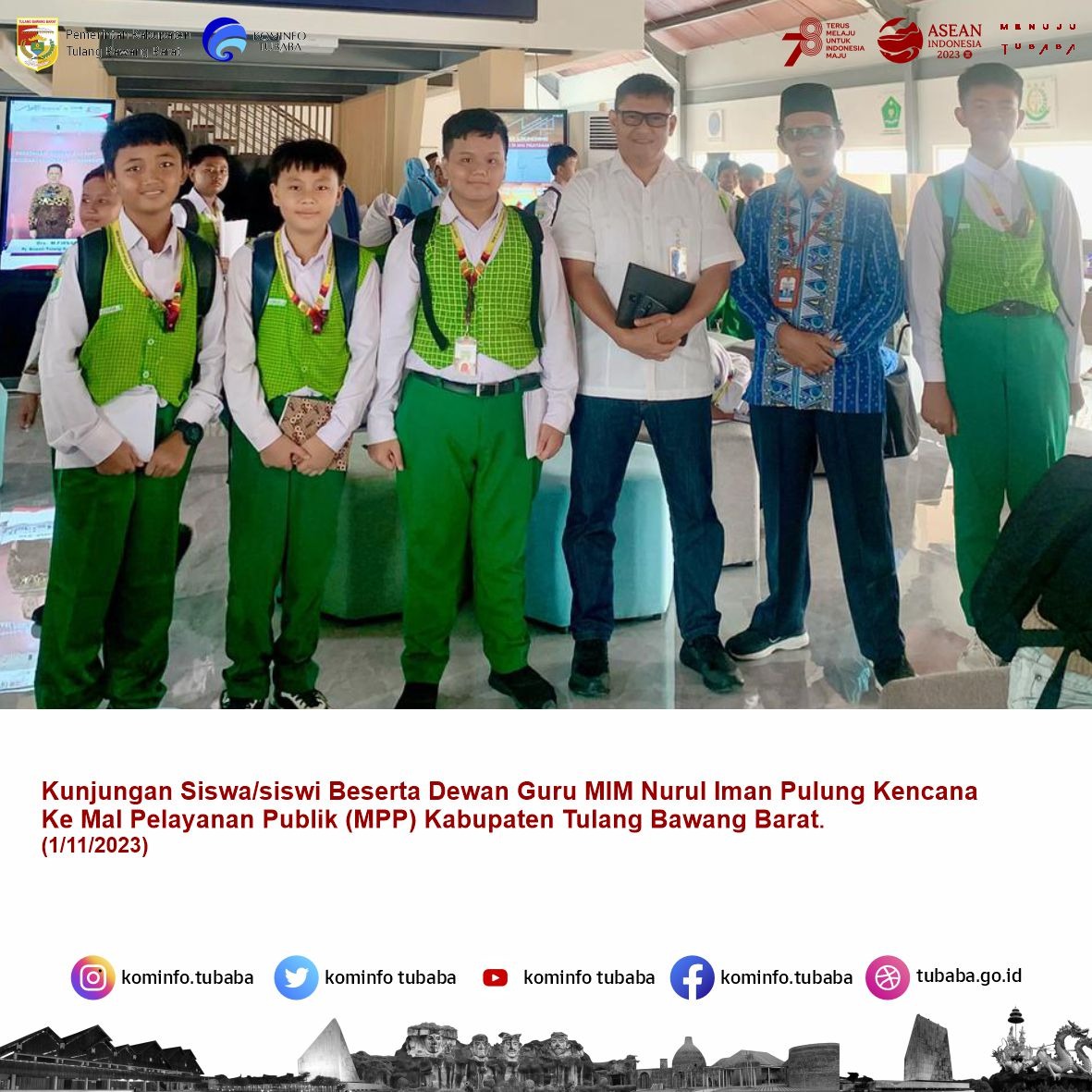 SULUHNEWS.ID,TUBABA. – Sebanyak 60 (enam puluh) siswa-siswi dan 10 (sepuluh) Dewan Guru Madrasah Ibtidaiyah Muhammadiyah (MIM) Nurul Iman Pulung Kencana, Kecamatan Tulang Bawang Tengah, Kabupaten Tulangbawang Barat (Tubaba) mengunjungi Mal Pelayanan Publik (MPP) Tubaba yamg terletak di Kompleks Kota Budaya Uluan Nughik pada Rabu (01/11/2023).