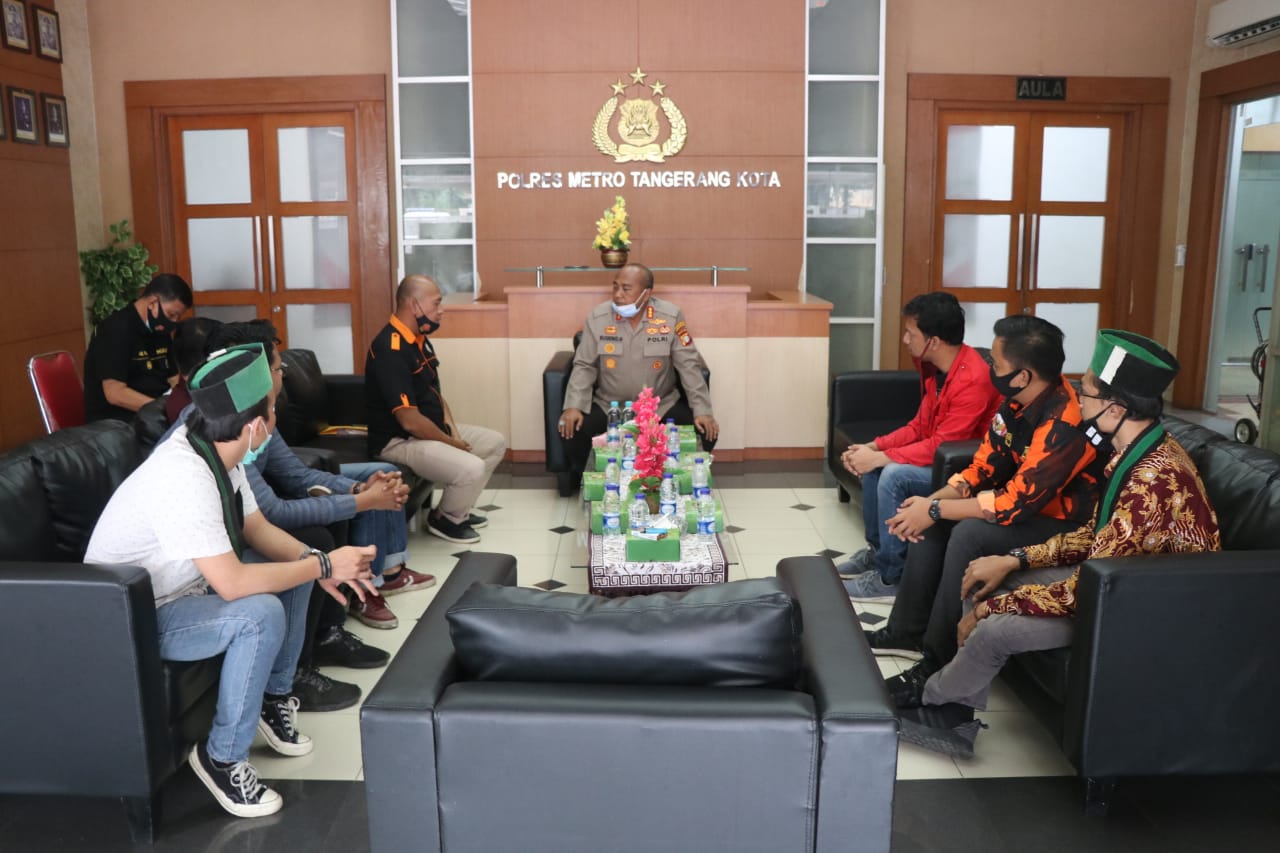 Mahasiswa Cipayung Plus Kota Tangerang audiensi dengan Kapolres Metro Tangerang Kota, Jumat (9/10/2020) pukul 14.00 WIB. Dalam pertemuan tersebut, Tiba Yudha Laksana, SH selaku Pimpinan Mahasiswa Cipayung Plus Kota Tangerang dan Ketua HMI MPO, Ahmad Ijat Jazuli, Ketua GMNI, Dede Herdian, Ketua HIMATA, Rifky Firmansyah, Sekretaris IMM, Bama Ladsega dan Haris Setiawan selaku Ketua Sapma diterima oleh Kapolres Metro Tangerang Kota, Kombes Sugeng Haryanto, S.IK, M.Hum dan Kasat Intelkam, AKBP Randi Ariyana, S.IK. M. SI.