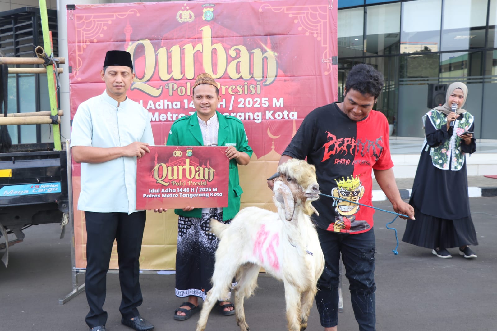 SULUHNEWS.ID, TANGERANG – Masjid Al-fatah Polres Metro Tangerang Kota, Polda Metro Jaya, menerima sebanyak 74 ekor hewan kurban pada hari raya idul adha 1446 Hijriah/2025 Masehi. Ke-74 hewan kurban sapi dan kambing tersebut sudah diserahkan dan salurkan kepada masyarakat yang berhak menerimanya.