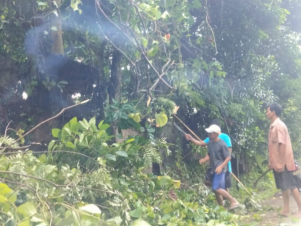 “Anggota Polsek Cikeusal Aipda Indra Permana dan masyarakat membantu membersihkan Jalan Raya Petir Cikeusal akibat curah hujan yang tinggi pada subuh hari sehingga menimbulkan patahan perpohonan jatuh ke jalan dan mengganggu pengguna jalan raya tersebut.