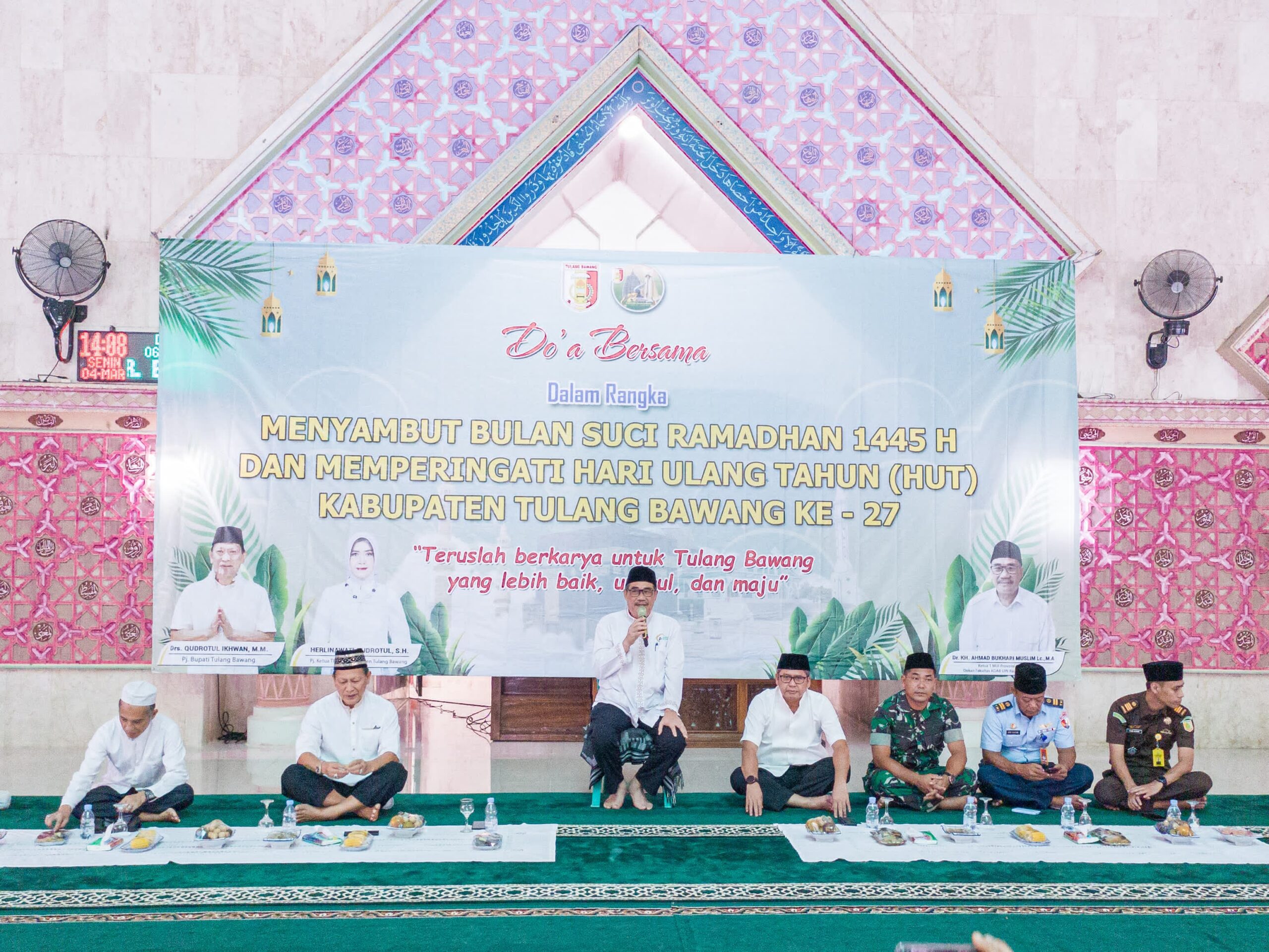 SULUHNEWS.ID, TULANG BAWANG – Pemerintah Daerah Kabupaten (Pemkab) Tulang Bawang menggelar Acara Pengajian dan Doa bersama dalam rangka memperingati HUT Kabupaten Tulang Bawang ke-27 tahun 2024 siang tadi, di Masjid Baiturrahman Islamic Center, Menggala. Senin, 04 Maret 2024.