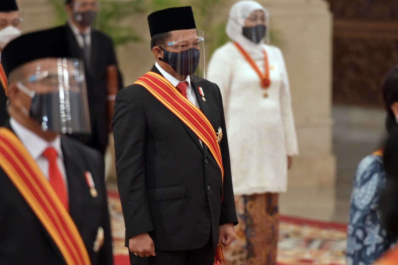 “Menganugerahkan tanda kehormatan Bintang Mahaputera dan Bintang Jasa kepada mereka yang nama, pangkat, dan jabatannya tersebut dalam lampiran keputusan ini sebagai penghargaan atas jasa-jasanya sesuai ketentuan syarat khusus dalam rangka memperoleh tanda kehormatan Bintang Mahaputera dan Bintang Jasa sebagaimana diatur dalam undang-undang,” kata Plh Sekretaris Militer Presiden Brigjen TNI Basuki Nugroho saat membacakan Keppres dalam upacara, Rabu (11/11/2020)