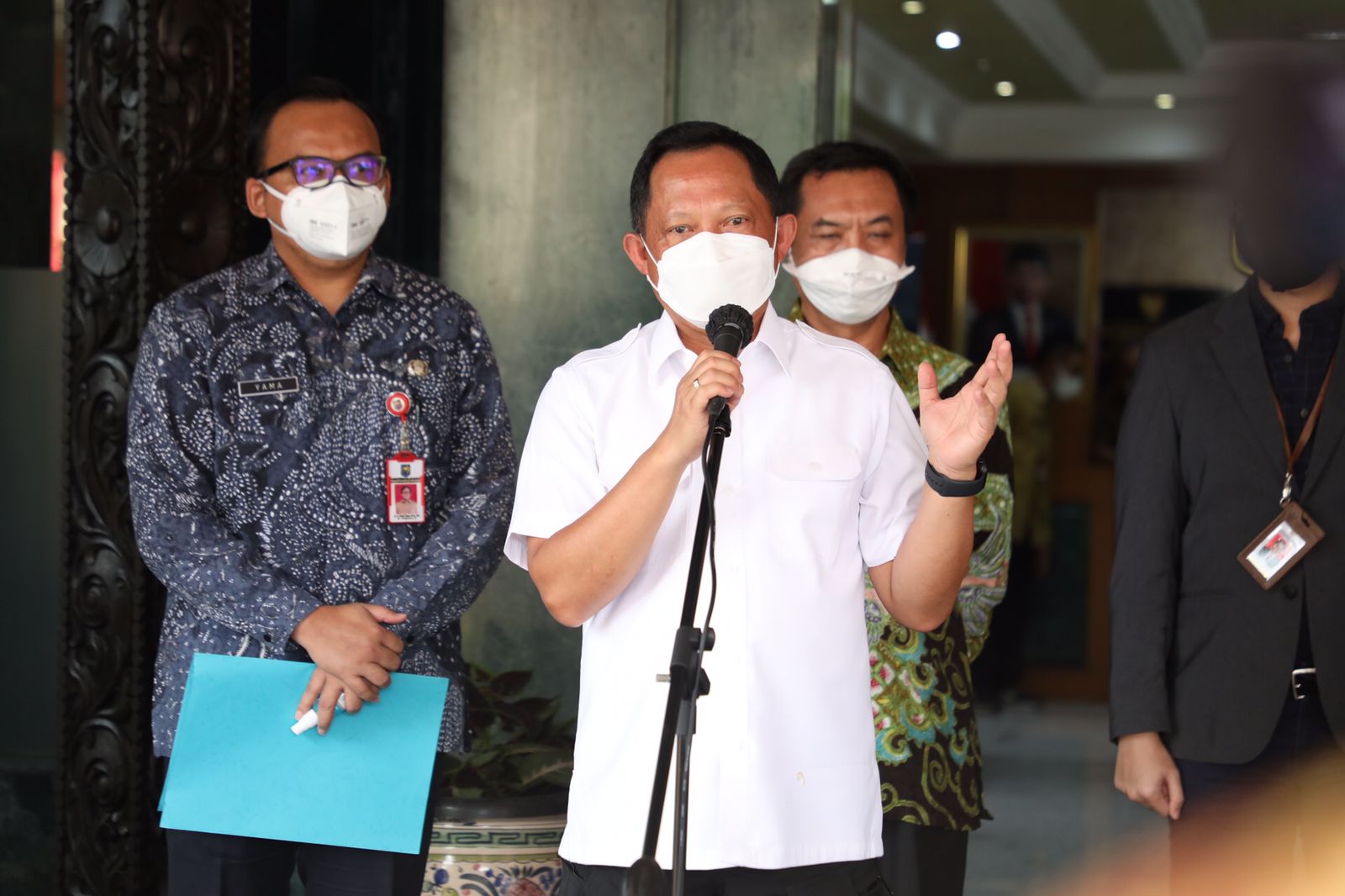 Hal itu disampaikan Menteri Dalam Negeri (Mendagri) Muhammad Tito Karnavian saat melakukan konferensi pers bersama Staf Khusus Presiden Bidang Sosial Angkie Yudistia di Lobi Gedung A Kantor Kemendagri, Senin (11/10/2021).