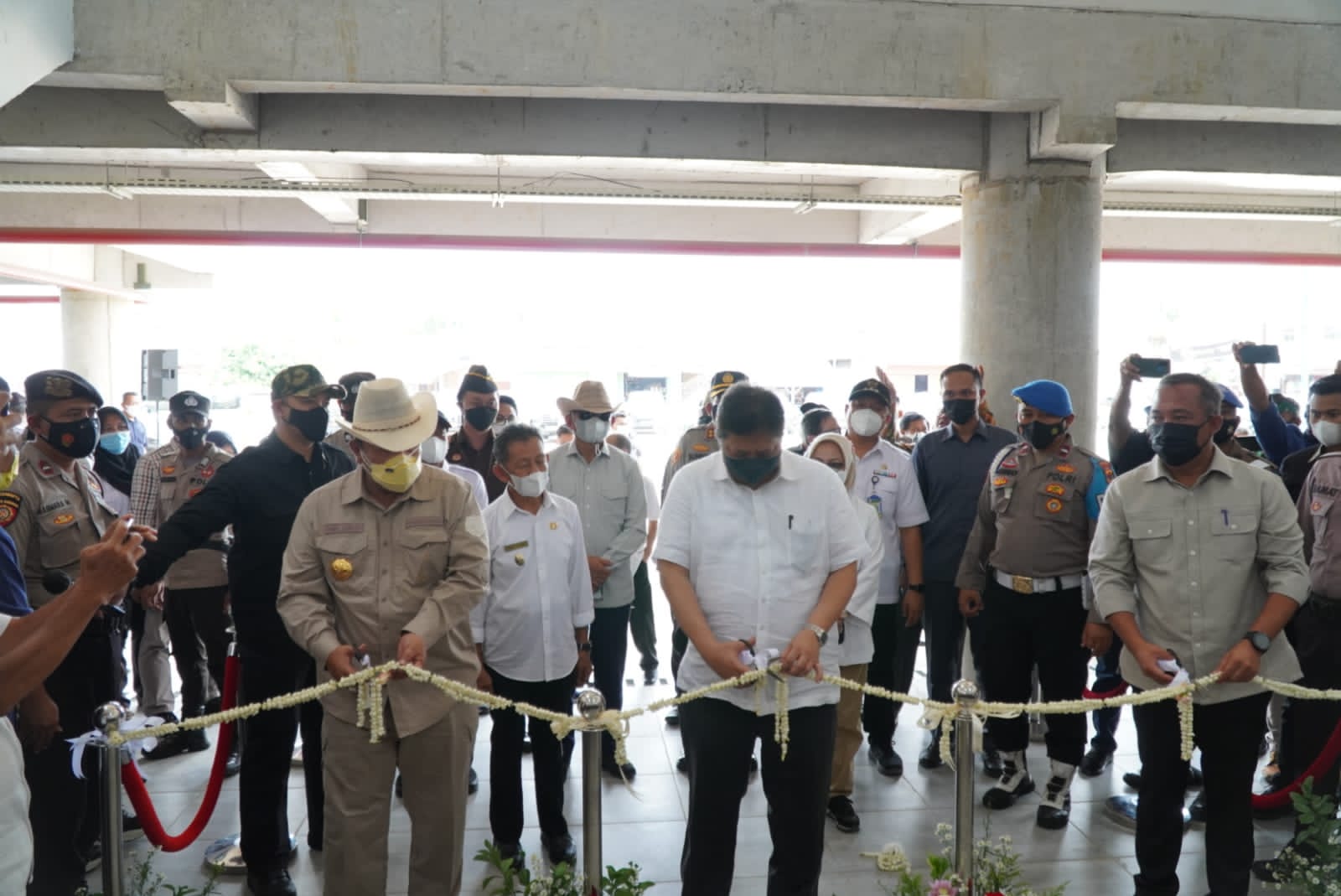 SULUHNEWS.ID, TUBABA– Menteri Koordinator Bidang Perekonomian RI Airlangga Hartarto di dampingi Gubernur Lampung Arinal Junaidi dan Bupati Tulangbawang Barat Umar Ahmad meresmikan Pasar Pulung Kecamatan Tulangbawang Tengah Kabupaten Tubaba, Sabtu (12/2/22).